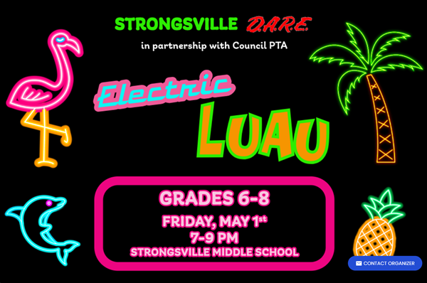 Strongsville DARE is excited to partner with Strongsville Council PTA to celebrate the end of the school year with a fun ELECTRIC LUAU! This event will be a tropical themed glow party with music, dancing, laser tag, games & more! All 6th, 7th and 8th graders residing or attending school in Strongsville are invited to attend.