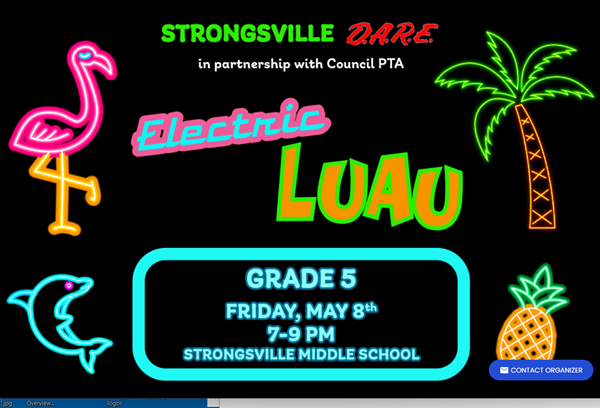 Strongsville DARE is excited to partner with Strongsville Council PTA to celebrate the end of the school year with a fun ELECTRIC LUAU! This event will be a tropical themed glow party with music, dancing, laser tag, games & more! All 5th graders residing or attending school in Strongsville are invited to attend.