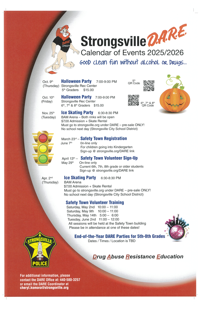 Strongsville's D.A.R.E. Program is recognized as one of the best D.A.R.E. programs in the State of Ohio. Strongsville's D.A.R.E. officers, with the help of D.A.R.E. coordinator, Cheryl Komora, host numerous events throughout the year to reinforce what has been learned and to stress the importance of healthy alternatives to drug use. These events include;
